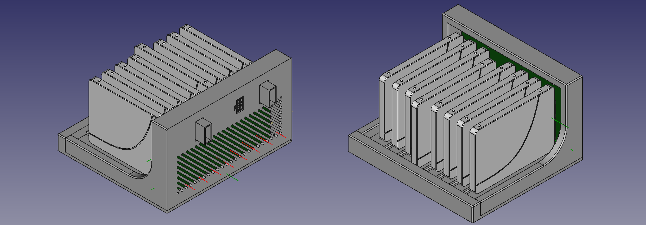 In the mean time, I could get started with designing an enclosure for the PCB. I wanted to mount it on top of my PC case, and make the disks easily swappable. As there were holes in the PCB for airflow, I added a grille to the enclosure design as well. Mostly because it looked better, but also just in case if I ever needed to quickly introduce some active cooling there.